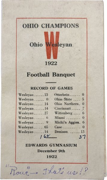Ohio Wesleyan had yet to be dubbed the Battling Bishops. That nickname wasn’t adopted until 1925 when Pi Delta Epsilon journalism fraternity held a contest to create a nickname. In 1922, Ohio Wesleyan teams were known as the Red and Black or the Methodists. (They weren’t playing the Buckeyes, either. Ohio State didn’t officially adopt that nickname until 1950.)