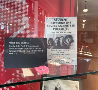 A display recalling concerts caught my eye. The caption declares that Crosby Stills Nash and Young took to Gray Chapel stage and rocked the campus. That didn't happen.