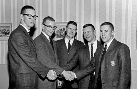 The mystery photo in your magazine includes my swimming teammates probably Class of 1960, Ed Lash, Larry Lays, and Jim Brown with coach Dick Gordin. I could not identify the fourth person.