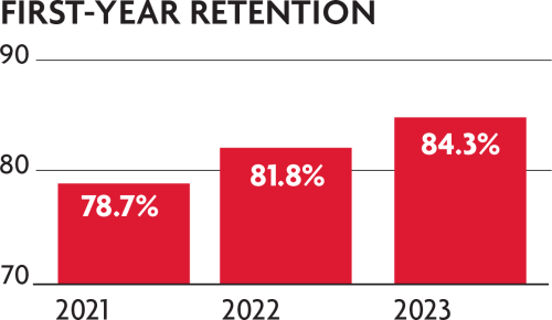 "Our first-to-second-year retention rate is 84.3% for the class that entered in fall 2022," President Matt vandenBerg, says. "That is 2.5 percentage points above the rate for the class that entered in 2021—and fully 5.6 percentage points higher than the class that entered in fall 2020. It is our highest retention rate since the class that entered in fall 2009.