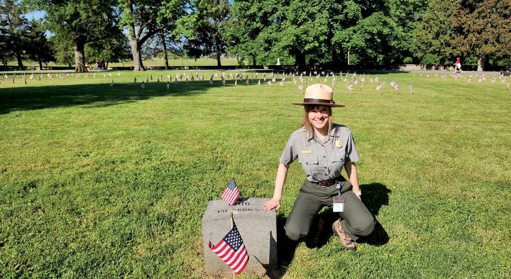 One of her most memorable encounters was an exchange with a young girl in the Soldiers' National Cemetery. "I had given a speech for Independence Day that had apparently impressed her. She walked up to me at the end of the program and told me that she wanted to be a park ranger like me one day. One of the photographers caught the conversation between us and took a picture. I can't help but look at that photo with pride, because the girl I was talking to was a miniature version of me, right down to the blonde hair."