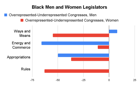 The chart at right shows that while Black male legislators, over time, have been slightly overrepresented on Ways and Means, they have been significantly underrepresented on Energy and Commerce and on Appropriations. For Black female legislators, it's worse. They've been underrepresented on all of the top four committees.