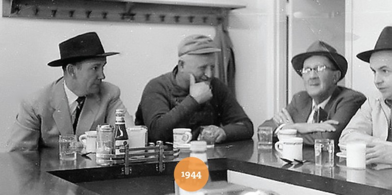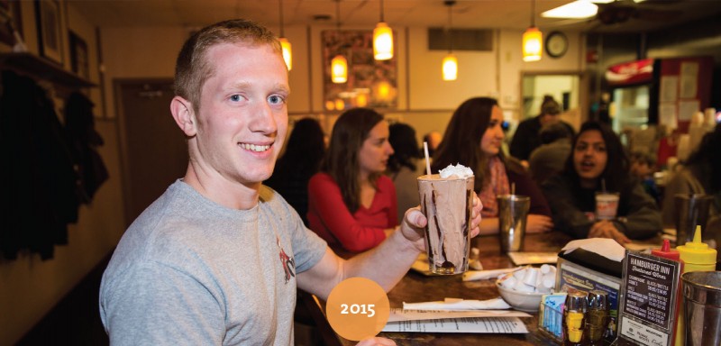 The Hamburger Inn, established in 1932, is much more than a well-known burger joint—it’s an Ohio Wesleyan student tradition that Ben Miller ’16 calls “the heart and soul of OWU.” Just as the Local Farmers Coffee Club gathered to share a cup of brew in 1944 (above), groups of friends today still go there to share coffee—and milkshakes! From left (below): Michael Durfee ’17, Miranda Ames ’16, Natalie Geer ’16, and Maha Shahid ’18. The restaurant underwent renovations in December 2013, in which the floors in the dining area and bathrooms were replaced and a new patio and two new bathrooms were built. Kitchen equipment was added and updated, the front windows were replaced, and new heating and cooling was installed. The front door and facade of the building were both restored to original condition. Despite all the spit and polish, however, these restorations don’t take away from the diner’s atmosphere, a proud tradition that has lasted 84 years.