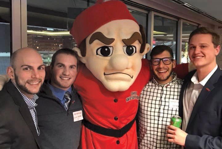 Cleveland event attendees at at the Infiniti Club at Progressive Field (from left): James DiBiasio ’12, Kevin Herman ’15, Bob the Bishop, Colton Poncsak ’14, and Blake Adkins ’15.