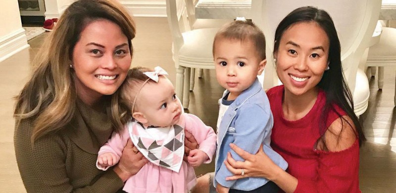 Marya Christina Intal Fischer ’07 (left) and Ha Nguyen Feinglass ’06 (right) pose with their “future Bishops,” Elle Grace Fischer and Zahn Feinglass.