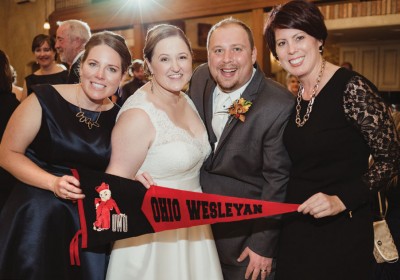 Erika Hankins ’11 married Michael Prantil on March 17, 2017, in Gray Chapel at Ohio Wesleyan. Wedding party members behind the bride and groom in Slocum Reading Room (from left): Laura Bishop, David Prantil, Christina Yost Lelache ’11, Sarah Kenny ’11, Rachel Bowes ’11, Robert Hankins, and Amadea Weber ’12.