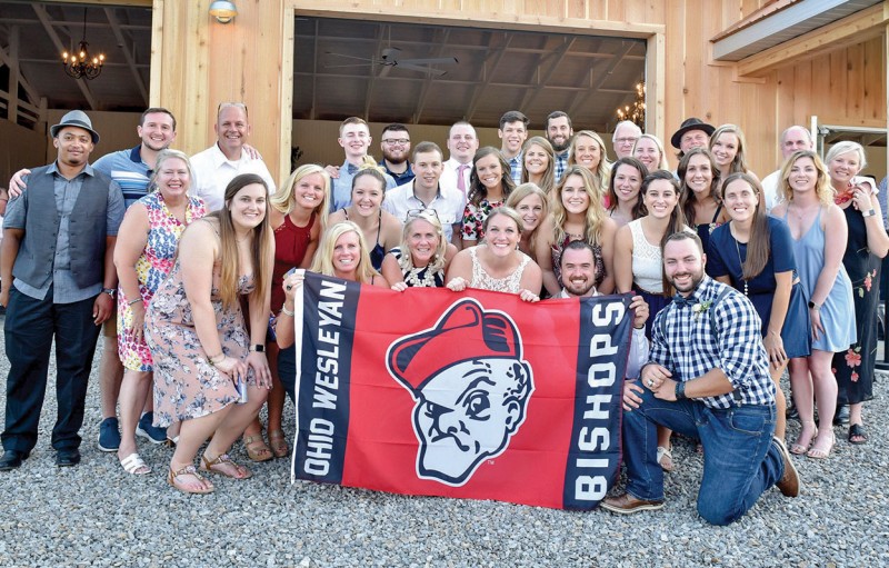 Tamra Londot ’14 married Cameron Pappa ’16 on Aug. 14 in Utica, Ohio. OWU classmates, alumni, and coaches joined in the celebration. Londot played volleyball, basketball, and softball at OWU. Pappa played football. Pictured from left: (front row) Kristen Henning ’15, Stacey Lobdell (current OWU women’s basketball coach), Nan Carney-Debord (former women’s basketball coach), the bride and groom, Devon Fisher ’16; (middle row) Boo Kuchers (Athletes in Action leader), Sarah McQuade ’15, Katie Fain ’14, Tyler Jenkins ’16, Amanda Barker Richards ’13, Danielle Haley ’14, Chelsea Denman ’15, Rachael Carter ’16, Brooke Warner ’15, Morgan Hall ’13, Brooke Nethers ’13, Allisha Ferguson ’16; (back row) Sean Miliner ’15, David Males ’17, Matt Kuchers (Athletes in Action leader), Ben Pelkey ’16, Bryan Ansel ’16, Ryan Ehrhardt ’19, Chase Culbertson ’16, Erica Bryan ’14, Aaron Port ’16, Erika Reese ’13, Pat Huber ’62, Amanda Hatfield ’14, Jake Sanders ’17, Sarah Flint ’16, Roger Ingles (former OWU athletic director), and Jo Ingles (OWU newspaper advisor).