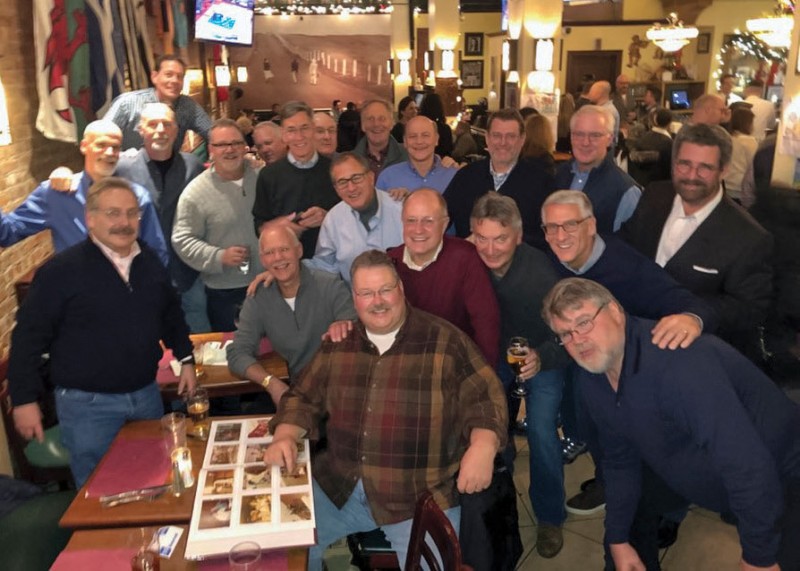 Phi Kappa Psi alumni got together (no reason, except they decided the time was right) on Dec. 7 at O’Lunney’s Times Square Pub in New York. Pictured from left: (front row) Matthew Schoengood ’78, Pete Kaestle ’77 (seated), John Green ’79 (seated), Jim Newman ’80, Les Kaciban ’80, Joe Angel ’79, Rob Shaw ’80, Mark Rodan ’80; (middle row) Tom Kane ’81, Clay Miles ’80, Jeff O’Sullivan ’81, John Whitaker ’81, Robert Fishman ’79, Sam Adams ’82; (back row) Steve Kjellman ’82 (standing on bench), Dave Griffin ’80, Tom Benton ’82, John Berger ’81, Scott Bedson ’81, and Doug Brown ’81. Not pictured: Tom Jolly ’77.