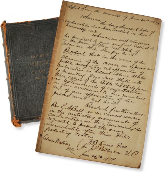 Beeghly Library recently received a Bible originally presented to Ohio Wesleyan’s first female graduate, Inez White Dial. In 1879, the OWU Alumni Association presented the Bible to Dial as she received her degree from the newly coeducational University. Dial’s granddaughter, Rebecca Lovett, donated this historic find to the University. The 1879 degree followed Dial’s first bachelor’s degree in 1875 from Ohio Wesleyan Female College, shortly before its merger with Ohio Wesleyan University in 1877. She received a master’s degree from the University in 1883. Pictured is the inscription in the Bible.