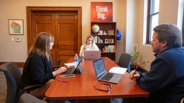 From left, OWU Connection Coordinator Jill Hayes, OWU Connection Executive Director Megan Sanders Ellis ’05, and OWU Connection Associate Dean Dave Markwardt meet in the third-floor OWU Connection offices.