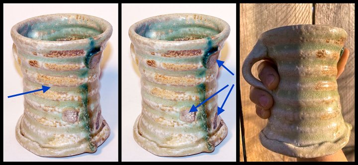 In the left photo, I present one of my favorite mugs, by an unknown maker. The unique circular grooves on the surface are the first clue about how this object was made, indicating it was made on the wheel. This type of texture can be made only by human fingers running across the form while it turns on the potter’s wheel.