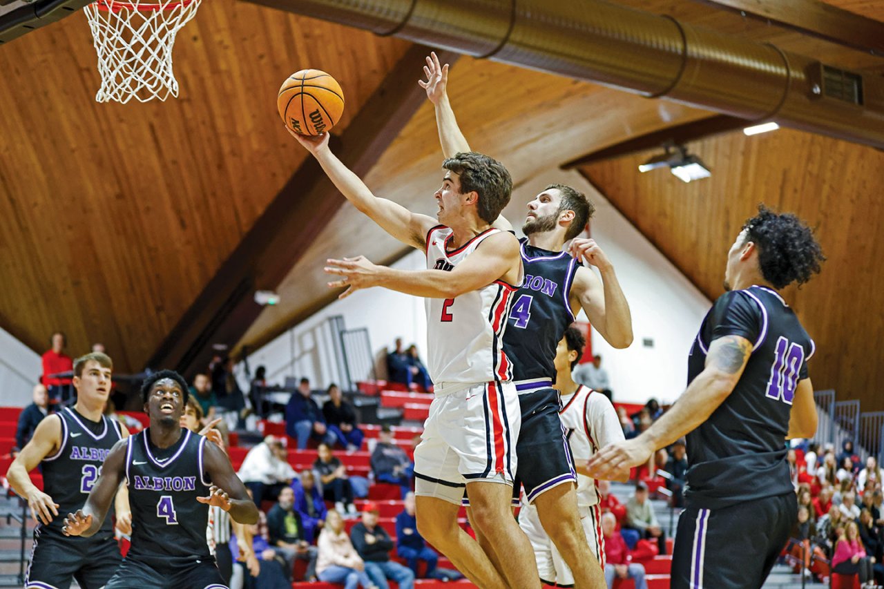 Henry Hinkle '25 was a first-team All-NCAC and third-team All-Region 7 selection after finishing third in the league in scoring (18.8/game), first in free throw percentage (88.2), and fourth in assists (83) and 3-point field goals (54). (Photo by Paul Vernon)Led by NCAC Player of the Year Kasey Schipfer '24 (top) and NCAC Defensive Player of the Year Elizabeth Homan '24, the Bishops shared the NCAC regular season championship with a 23-7 record and advanced to the second round of the NCAA D-III tournament. Schipfer was one of 10 women's finalists for the Jostens Trophy, which honors the most outstanding men's and women's NCAA D-III basketball players of the year. She also was the Region 7 Player of the Year, Academic All- American, and third-team All-American. Her many accomplishments included leading the NCAC with 601 points (20/game), finishing second in rebounds (235), and fourth in field goal percentage (51.7). Homan led all NCAA D-III players in assists (208) and ranked second nationally in assists per game (6.9). She also set Ohio Wesleyan season (208, 6.9/game) and career (492, 5.5/game) records for assists and assists average. Both Schipfer and Homan also won Academic All-District recognition from the College Sports Communicators. (Photos by Paul Vernon)
