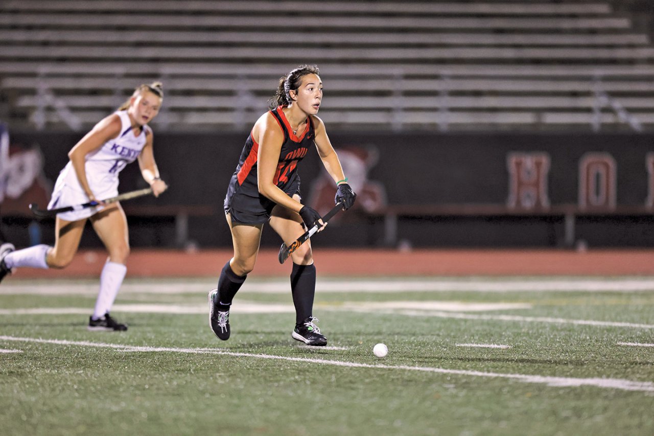 OWU went undefeated during the regular season, finishing 16-0, including 10-0 in league play to win the Bishops' first outright NCAC title since 1995. The only blemish on their 17-1 overall record was a 1-0 overtime loss in the NCAC tournament championship. Olivia Danley '26 was the NCAC Midfielder of the Year and was a first-team allregion pick by the National Field Hockey Coaches Association. She was second in the league in points (35), goals (14), and assists (7), and first in gamewinning goals (5). (Photo by Paul Vernon)