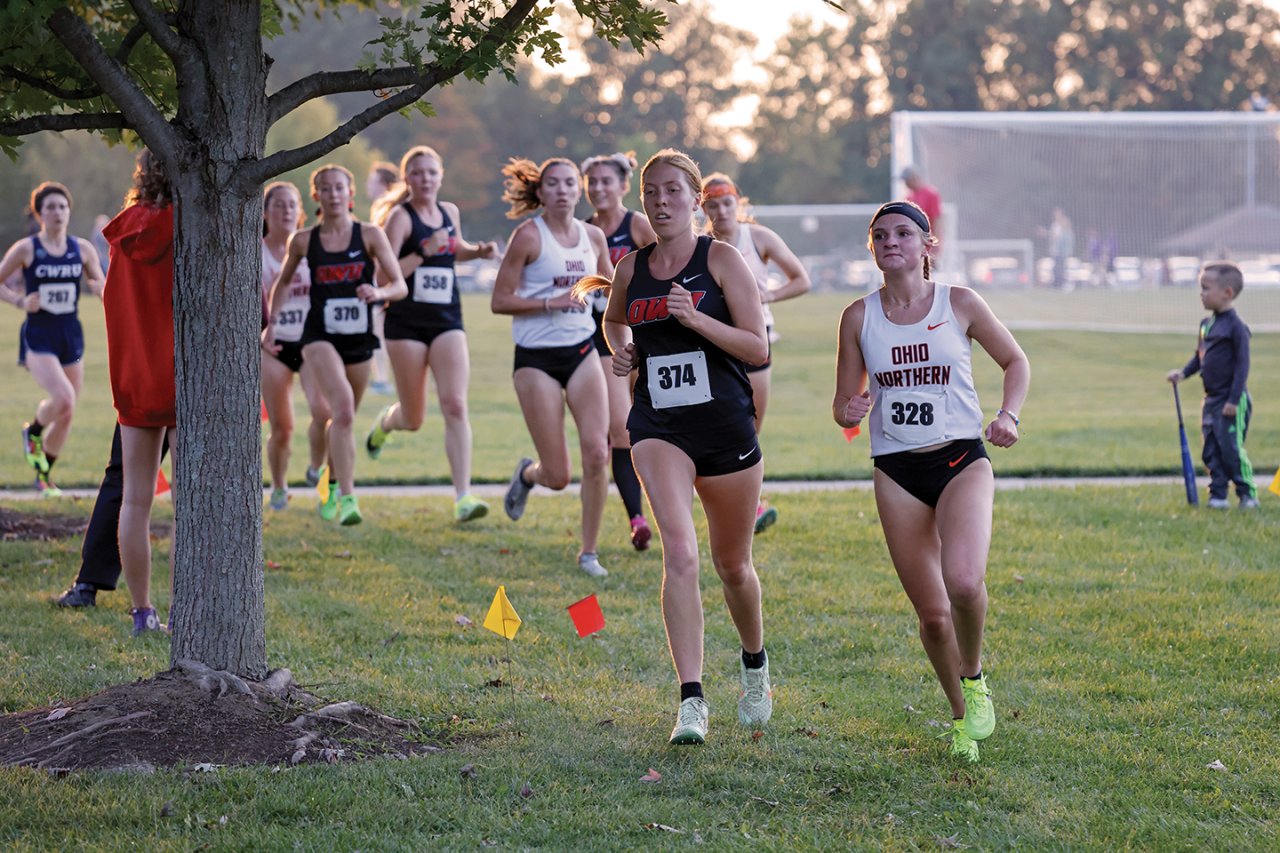 Zoe Ward '27 (No. 374) won All-North Coast Athletic Conference honors at the NCAC championship meet, finishing 10th and leading the Bishops to third place, OWU's best finish since 2014. Ward also won all-region honors at the NCAA D-III Great Lakes Regional championship meet, where her team finished 11th, the Bishops' best showing since 2015. (Photo by Paul Vernon)