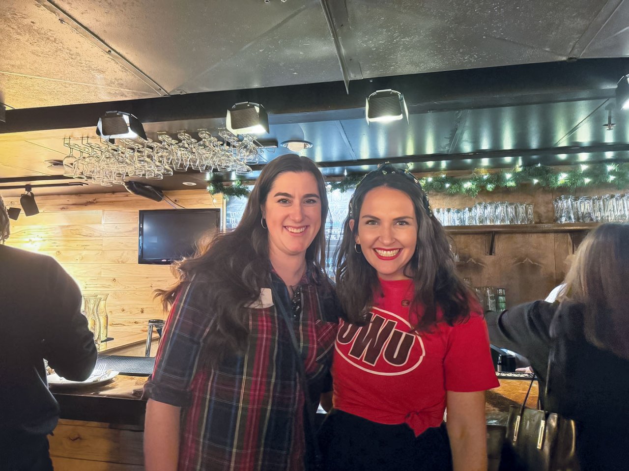 Getting together at the holiday party in Cleveland are Marie Rymut Schaefer '07 and Amanda Zechiel Keiber '09.