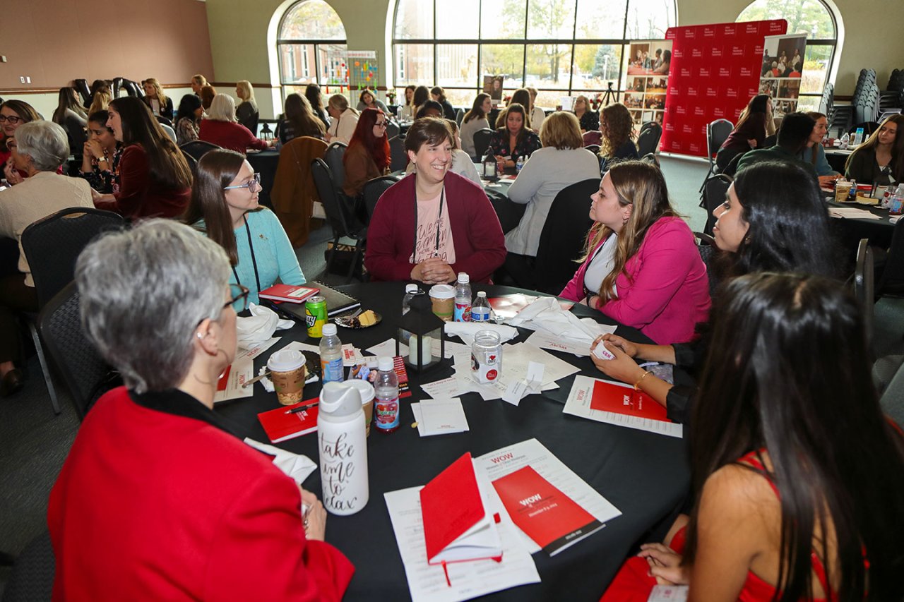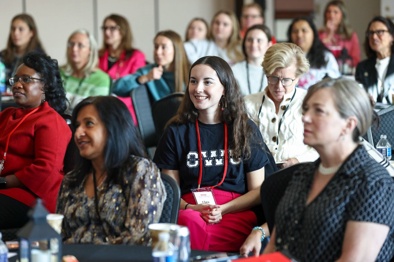 From left, Vernita Johnson '95, Mona Sharma Mattson '90, and Clara Wood '25 react during one of the presentations at Women of Ohio Wesleyan (WOW) Weekend in November.