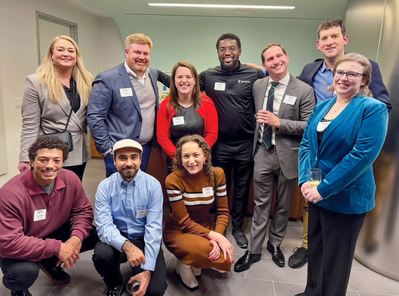 Alumni at the D.C. holiday party include (front) Christian Tesnow '24, Nadav Shaibe '21, Callia Barwick '24; (standing) Lindsey Queen '11, Taylor Beis '01, Alison Kennedy '10, Memme Onwudiwe '15, Dan O'Brien '05, Colin Campbell '05, and Allison Hall '05.