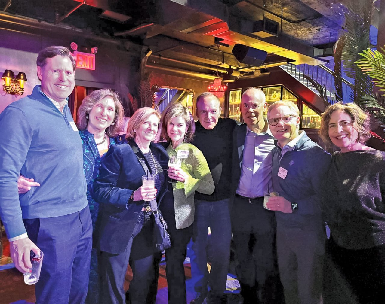 Reconnecting from the 1980s at the New York City holiday party are Kevin Breen '84, Lisa Lindeman Luckett H'84, Jennifer Keefe Anderson '84, Lauretta Kennedy Mulholland '84, Clark Gregg '84, Andy Taylor '84, Stephen Dodd '83, and Robin Langsdorf '83.