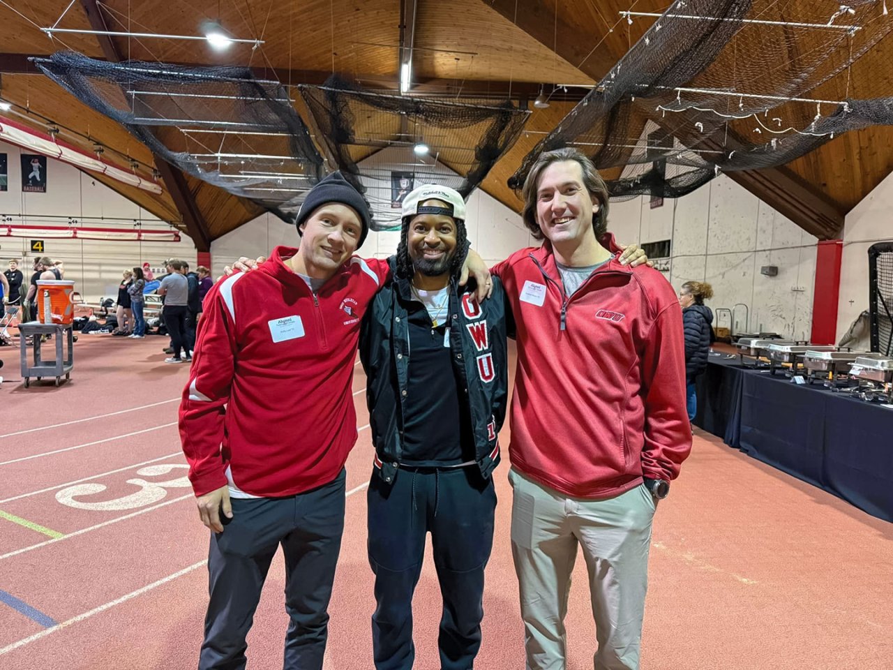 Getting together at the Red & Black Track Reunion in Gordon Field House are Kody Law '11, Ryan Ellis '09, and Andrew Bloom '09.