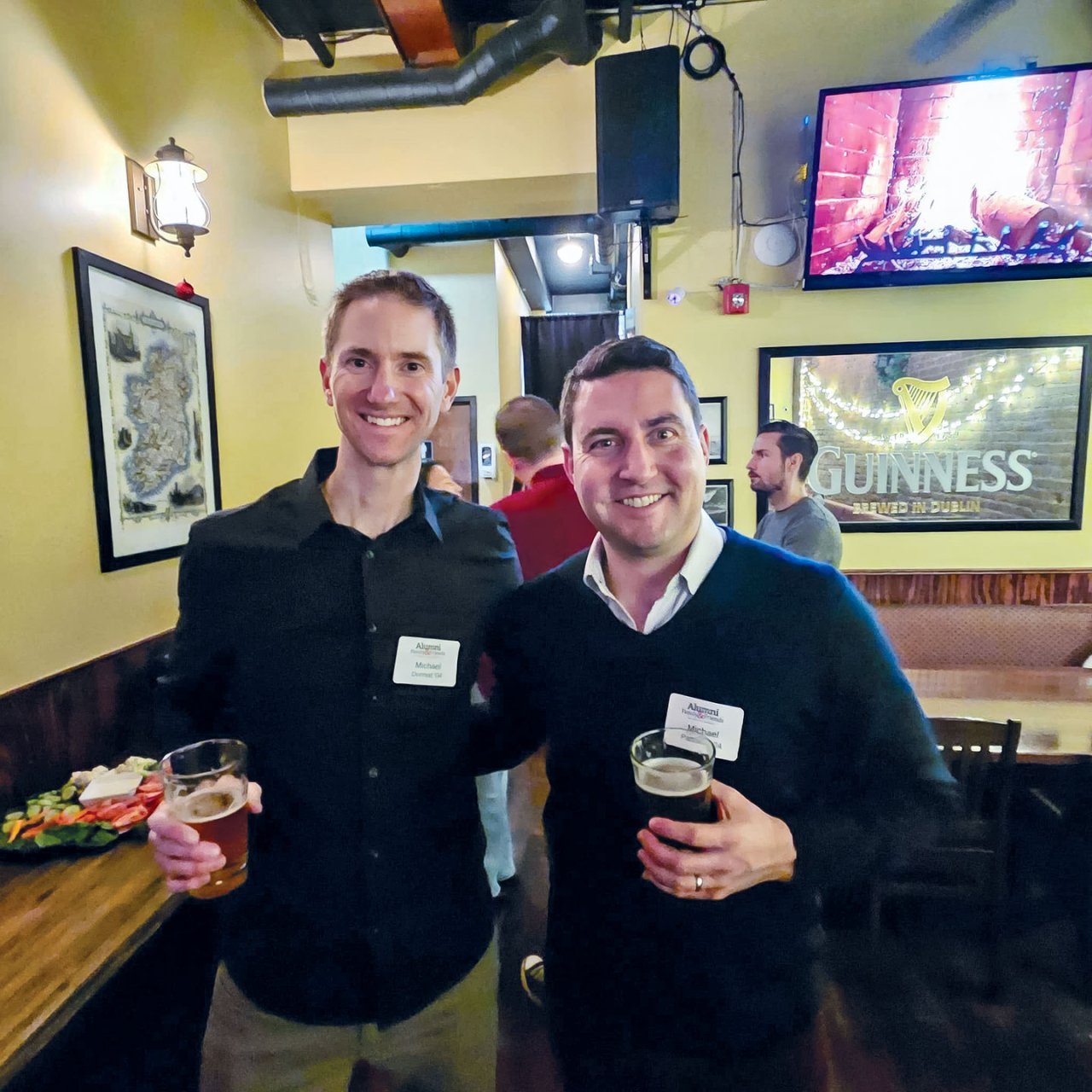 Michael Durniat '04 and Michael Pattison '04 catch up at the Denver holiday party.
