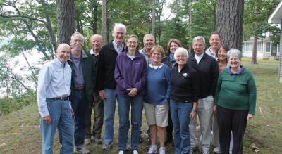 Former Bashford Hall dorm counselors and their wives have reunited frequently since graduation, most recently gathering in Glen Lake, MI, at the summer home of Bruce Alton ’61 and Christine Lichliter Alton ’62 from September 11–13, 2015. Together they remember when Bashford was a freshman men-only dorm, with Bruce serving as head resident. Pictured from left to right are: Bruce Alton ’61, Ph.D.; Steve Anderson ’70; Chris Dutton ’71, JD; John Morris ’70, MD; Lucy Morris, MD; Mark Shipps ’70; Ann Bradley Dutton ’71; Ginny O’Grady Shipps ’70; Chris Burns-Dibiasio; Dan DiBiasio ’71, Ph.D.; Mike Mickler ’71, Ph.D.; Reiko Mickler; and Christie Lichliter Alton ’62.