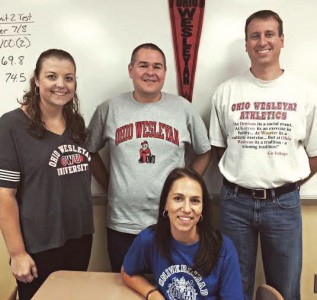 Ohio Wesleyan alumni who are teachers at Olentangy Liberty High School in Delaware County, OH, showed their school spirit on college t-shirt day. Pictured from left to right are: (back row) Alison Baxendale ’04, Chris Moore ’04, David Hale ’97, and (front) Ellie Huber ’05.