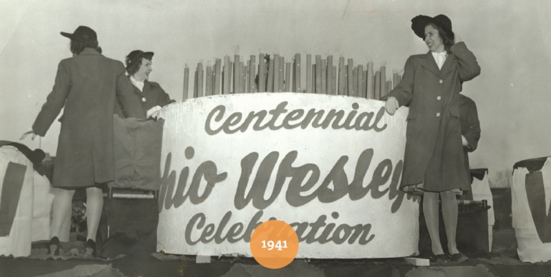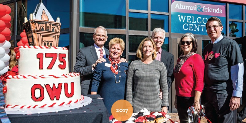 Students in 1941 celebrated the 100th anniversary of Ohio Wesleyan’s founding (for the 1941-42 academic year) with a Homecoming parade float. In October, students, alumni, friends, and faculty celebrated 175 years in grand style – with frosting! The co-chairs of the $200 million Connect Today, Create Tomorrow comprehensive campaign (pictured from left) Kevin J. McGinty ’70, Nancy Collinson McGinty, Kathie Bradford Milligan ’83, and John F. Milligan ’83, along with Melissa Lollar Jones and President Rock Jones, were joined by representatives from all groups of campus stakeholders as members of the Board of Trustees voted to take the campaign public, to much fanfare (and confetti).