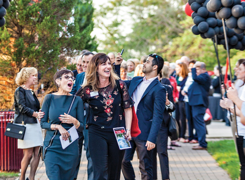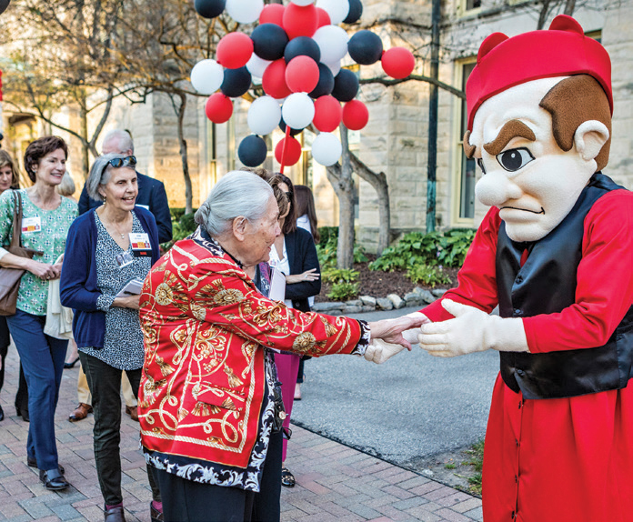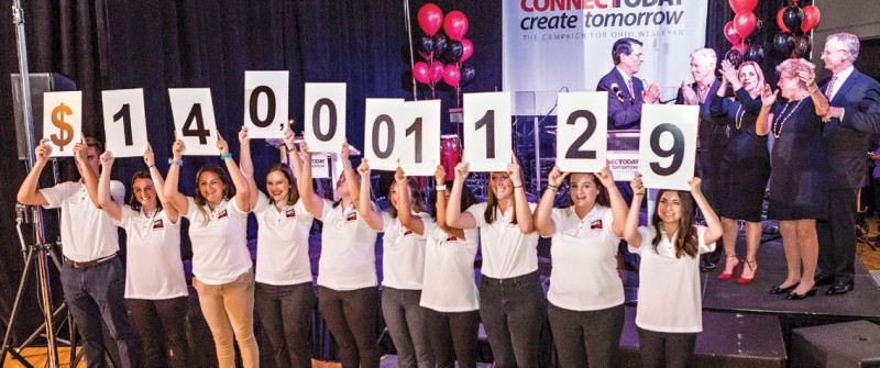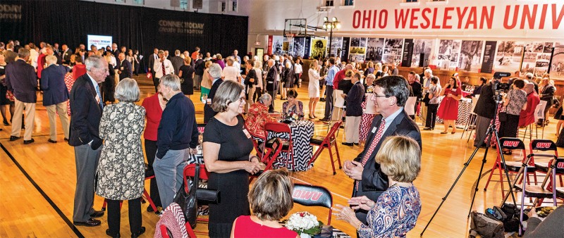 To formally kick off the public phase of the seven-year Connect Today, Create Tomorrow campaign, we invited everyone. The kickoff’s timing on Oct. 20 during Homecoming and Family Weekend was designed to encourage as many alumni, family, friends, and faculty and staff to take part in the festivities as possible. After the Board of Trustees’ noon vote to take the campaign public (see Campaign Kick-Off Week story and OWU Timescapes article) the big moment came that evening when the total raised in the three-year leadership phase of the campaign was revealed during a party in Edwards Gymnasium. The party also featured the debut of a special four-minute campaign video, which can be viewed at owu.edu/campaign.