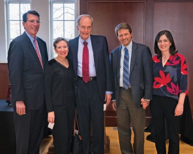 (From left) President Rock Jones with Margaret “Peggy” Wright DuPont ’61 and Herbert DuPont ’61, along with the holder of their newly endowed professorship, David Markwardt, associate professor of zoology, and Markwardt’s wife, Rachel Dwyer, at the formal installation dinner for the position in April.