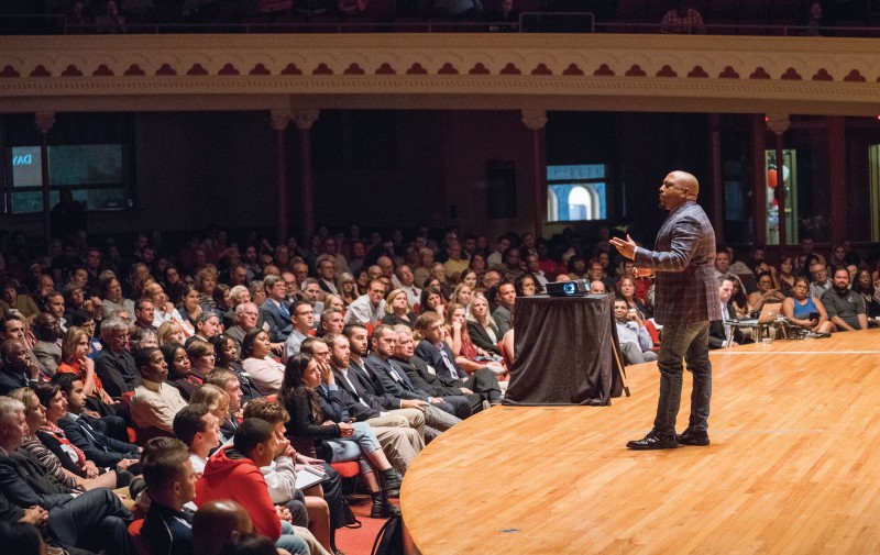 Entrepreneur Daymond John of TV’s Shark Tank addressed a packed Gray Chapel on Oct. 19 for OWU’s 2017-2018 Milligan Family Leaders in Business Lecture sponsored by the Woltemade Center for Economics, Business and Entrepreneurship. John, the founder and CEO of the FUBU clothing brand, discussed “5 Shark Points: Fundamentals for Success in Business and Life.”
