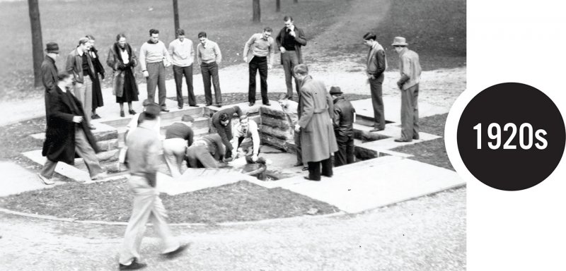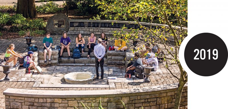 Belief in the benefits one could gain by drinking from Sulphur Spring prompted the growth of Delaware as a resort town in the 1830s, and it’s said that Rutherford B. Hayes, who would become the 19th U.S. president, met future first lady Lucy Webb at the spring. In the 1920s (top) and into the middle of the 20th century, freshmen were routinely dunked in the spring if caught without their dink (beanie cap). Today the steps and seating area around the spring have changed little, but the spring is capped and the mineral-rich water rarely flows. Below, a class of first-year students meets at the site.