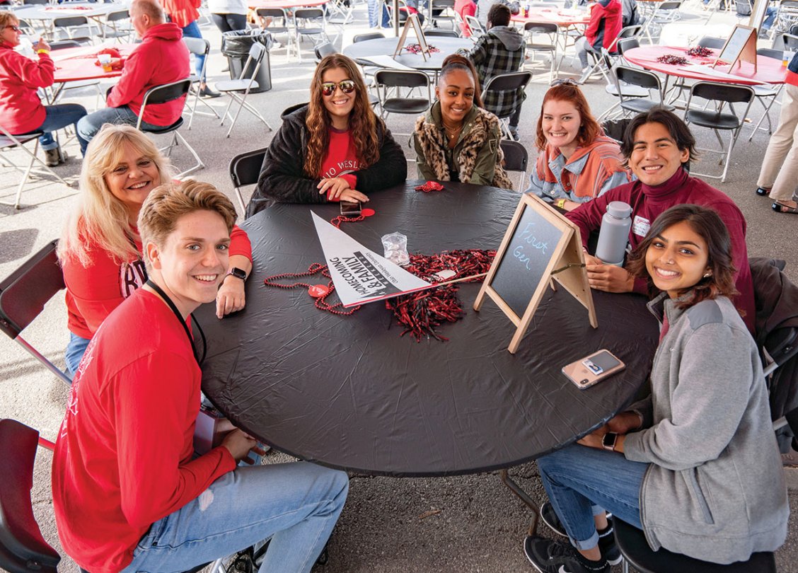 First-generation students and alumni connect at the tailgate, clockwise from lower left: Dylan Hayes ’20, Joy Purvis, Cheyenne Hall ’20, Devin Cotton’20, Kara Rutkowski ’22, Adrian Moran ’23, and Ankita Patel ’22.