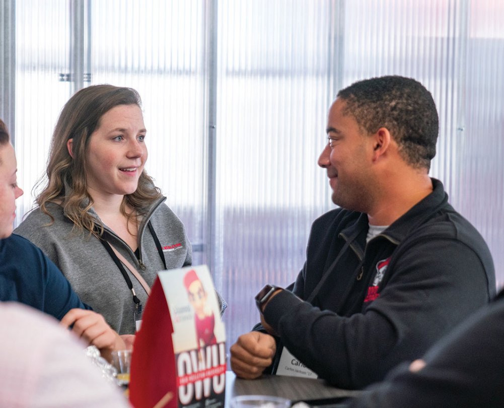 Bridget McQuaide ’16 talks to Carlos Jackson ’17 at Young Alumni Brunch.