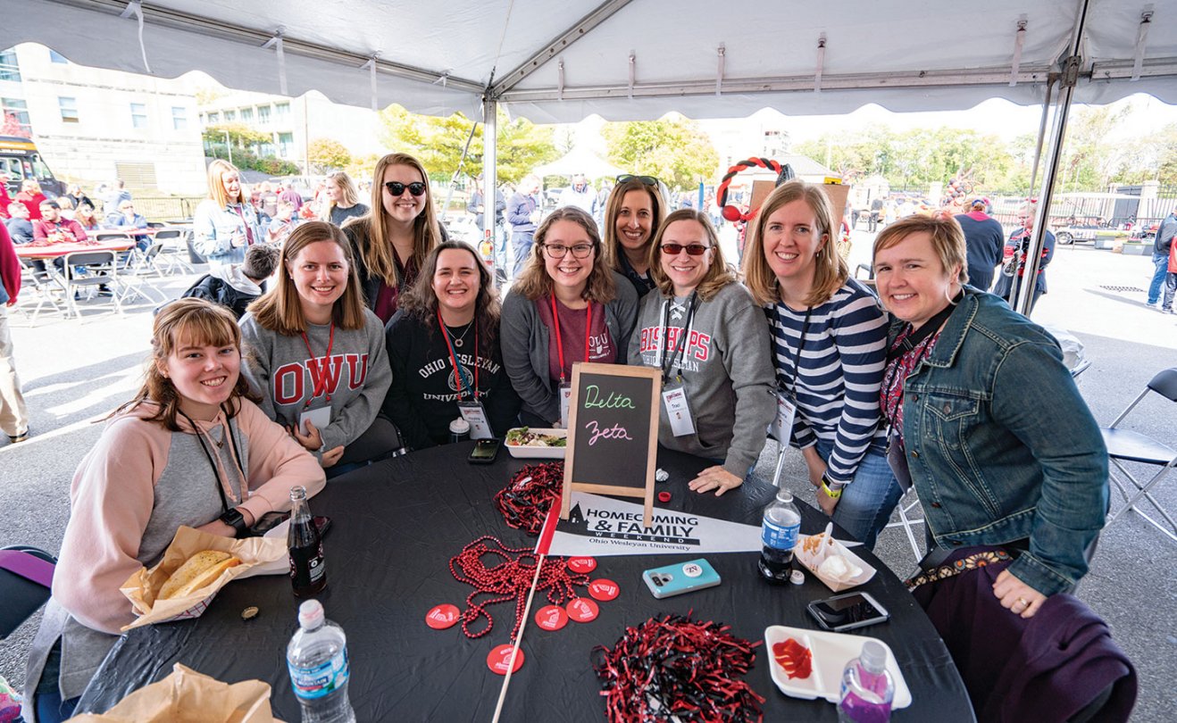 Delta Zeta tailgate gathering, from left: Katie Flack ’19, Katherine Bleile ’18, Katie Kuckelheim ’19, Hayley Glessner ’19, Charlotte Gross ’20, Denise (Sabo) Brenner ’00, Traci Kennedy-Brockfield ’01, Laura McCunn-Jordan ’01, and Carrie (Lippert) Reinhardt ’94.