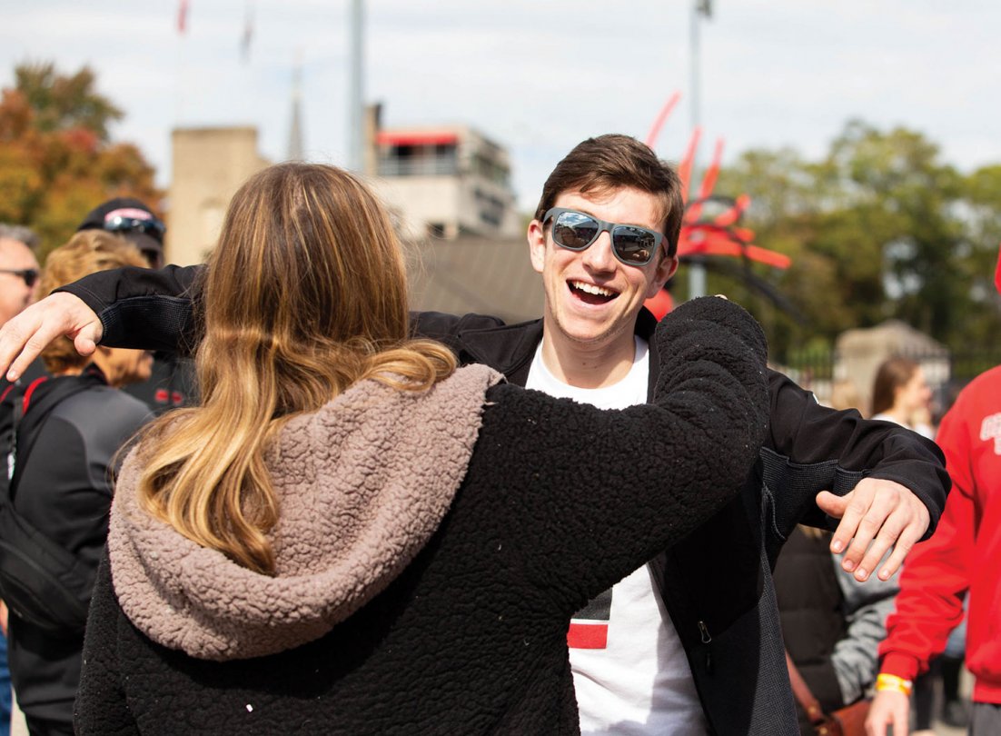 Kienan O’Doherty ’19 greets friend at tailgate.