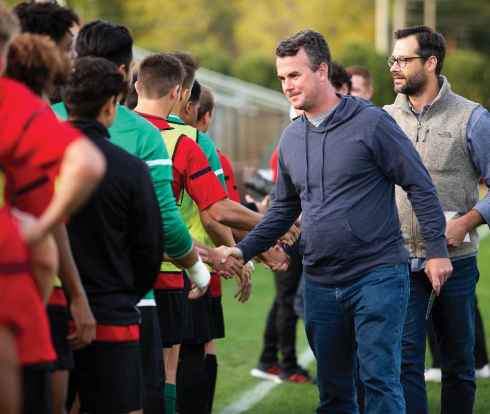 Members of the 1998 men’s soccer team, recognized as a Team of Distinction during the Hall of Fame ceremony, greet members of the current team. Pictured are Keith Rozanski ’99 (left) and T.J. Manfrass ’02.