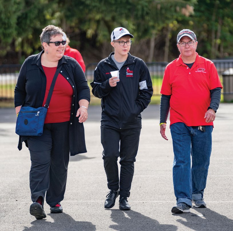 Marching band drum major Alex Gillooly ’22 with his parents, Kate and Greg Gillooly.