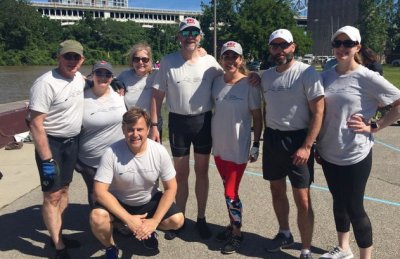 Rowing team “1X” is pictured at the 2019 Regatta, celebrating the 50th anniversary of the burning of the Cuyahoga river, which led to the Clean Water Act. The 2019 Regatta is sponsored by the Western Reserve Rowing Association, which includes more than 50 teams that row 8-person shells on the Cuyahoga river. Two Bishops — identified by the OWU hats — are members of the team. Carmen Bowen Pepe ’95 (Delta Delta Delta) is the heart of the team and has been with the team for 17 years, and rows in a key position (stroke), which sets the pace for the rest of team; Bob Jefferis ’79 (Fiji) is captain of the team and has rowed with the team for five years.