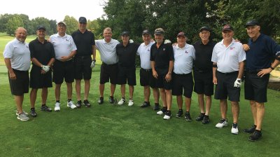 Twelve 1977 OWU Fijis reunited for their annual golf outing in Youngstown, Ohio. Since six are from Ohio and six from other states, they compete in a Team Ohio vs. Team USA “Ryder Cup” match each year. They are, from left: Bob DiBiasio, Ken Sternad, Greg Sponseller, Paul Eddy, Doug Kennedy, Bruce Smith, Chris Swift, Rick Goclano, Steve Walton, Dave Vadas, Byron Choka, and Greg McComas.