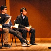 At the spring 2014 composition recital, members of the professional musical group Conundrum played pieces composed by OWU students. Shown working with…
