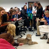OWU’s Circle of Life: Professor John Gatz, Emily Yunker ’09, and Whitney Marker ’07 show off Bibi, a young cheetah from the Columbus Zoo and Aquarium…