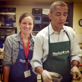 Courtney Durham ’12 and President Barack Obama are pictured here preparing meals at Martha’s Table in Washington, D.C. (Photo courtesy of Courtney…
