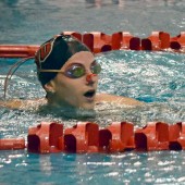 Jessica Ward checks the Meek Center scoreboard after setting a school record in the 100 backstroke. (Photo by Mike Serbanoiu ’15) Freshman Jessica Ward…