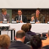 Panelists for the 2012 Economic Outlook Conference included (left to right) OWU Assistant Professor of Economics Goran Skosples, moderator; Pedro Amaral;…