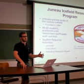 Zeke Brechtel ’13 is pictured here during a Wednesday noon presentation about his research on katabatic wind flows. (Photo by Andy Wittenberg ’13) Several…