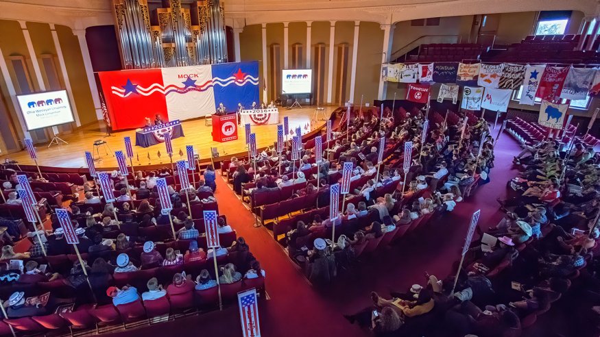 This year’s Mock Convention will kick off at 4 p.m. Feb. 21 (doors open at 3) with opening ceremonies, including the traditional call to order, presentation of colors, national anthem, and installation of convention chairs. Following a dinner break, platform debates will begin at 7 p.m. and continue into the night.