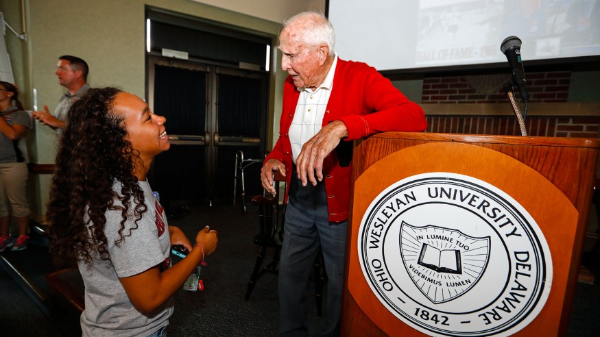 Student-athlete Sara Johnson ’17 shares a story and a smile with OWU’s first-ever NCAA cross country national champion, Quentin Brelsford ’48, who spoke on campus Sept. 8. (Photo by Paul Vernon)