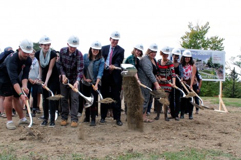 Ohio Wesleyan celebrated the groundbreaking of its new Small Living Unit ‘SLUplex’ on Sept. 25. Sharing in the celebration are (from left) Cameron Pappa ’16 (House of Spiritual Athletes), Sarah Lucas ’16 (Citizens of the World House), Chase Montana Smith ’17 (Interfaith House), Emma Drongowski ’16 (Honors House), OWU President Rock Jones, Emma Sparks ’16 (House of Peace & Justice), Alanna Spalsbury ’16 (Modern Foreign Languages House), Reilly Reynolds ’16 (Tree House), Kaila Johnson ’16 (House of Black Culture), and Lissette Gonzalez ’17 (Sexuality and Gender Equality House). (Photo by Hannah Wargo ’19)