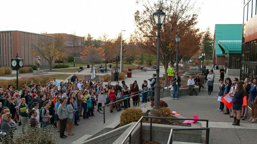 Ohio Wesleyan students gathered for the first SlutWalk (shown here) in 2011. The event, held first in Canada, raises awareness about resources available to and society’s perceptions of sexual assault victims. (Photo by Chris Henchey ’14)