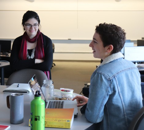 Emily Howald ’18 (left) and Peyton Hardesty ’20 discuss campus recycling as part of their sustainability practicum with professor John Krygier. Over the past several years, students in the class have helped to document Ohio Wesleyan’s sustainability efforts as a way to help inform future green initiatives. (Photo by Cole Hatcher)